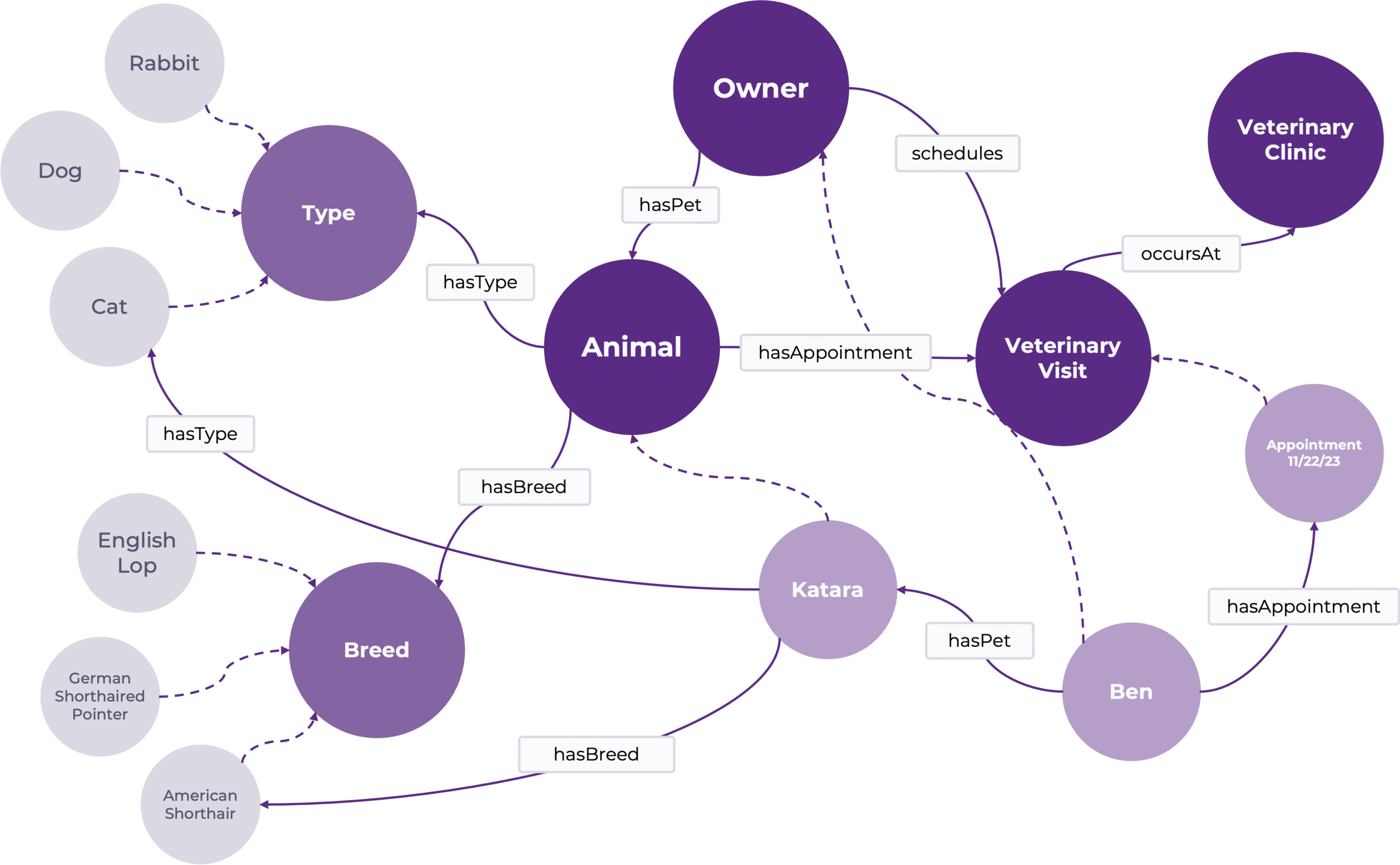 Within the graph model, we’ve captured the taxonomies that can be used to fill out information on an animal’s Type and Breed as well as cardinality of relationships to ensure that the data and its use remains accurate. And, because we are using a knowledge graph, all of this information is machine readable, allowing us to do things like query the graph. Going back to the first example, we can ask the graph for the name of Katara’s Owner vs Katara’s Name to receive the contextually correct response (see the sample SPARQL query below).